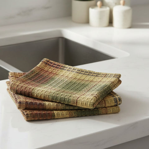 You will love the fresh look of the Saffire Dishcloths Set of 3. Sage green, barn red, blue and sand combine to create a beautiful farmhouse flair! Also available in coordinating placemats, table runners, napkins, dishtowels, and window treatments (all sold separately).