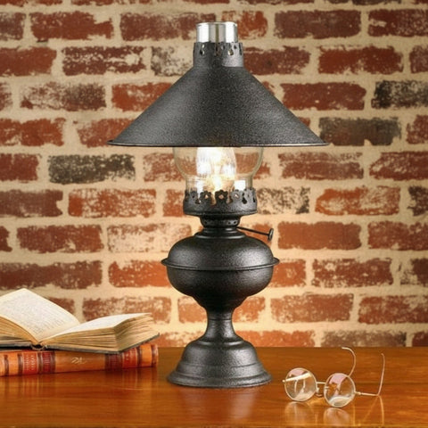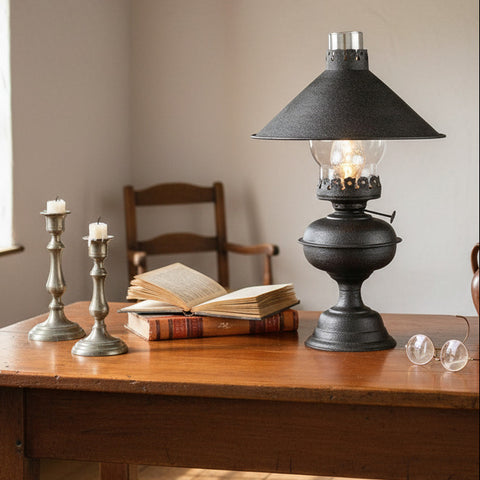 Our Hartland Lamp with Shade is an ideal accent piece in your country or primitive home. Hand crafted with a unique style and charm reminiscent of a 19th century oil lamp, it features a textured brown-black rustic finish. Shade and chimney are included.