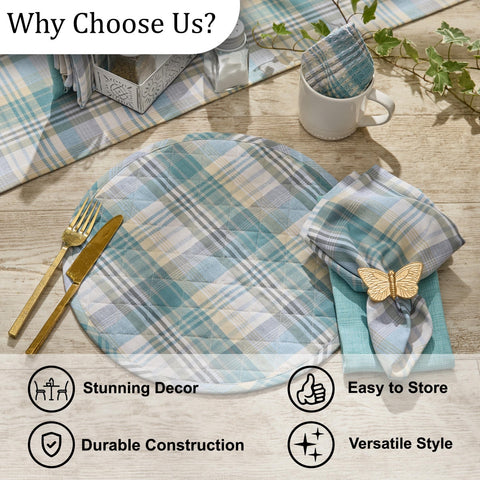 Elevate your table with our Water Blue Plaid Round Quilted Placemats. Crafted through traditional techniques, each placemat showcases thoughtfully curated Spring tones and subtle pattern work that complements any sophisticated tablescape. The natural construction offers both visual elegance and practical resilience to any spring table.