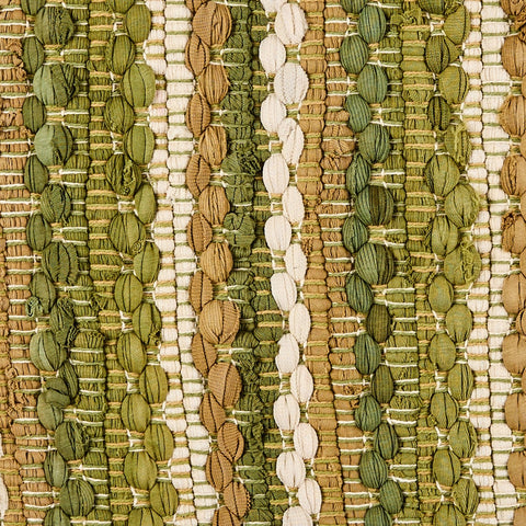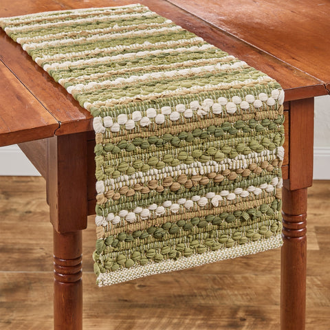Add a cozy country touch to your kitchen with our Pear Grove Chindi Table Runner. Featuring a beautiful woven design in green, tan, and white, it's perfect for adding texture and warmth to any table, this table runner is a must-have for any rustic country primitive kitchen.