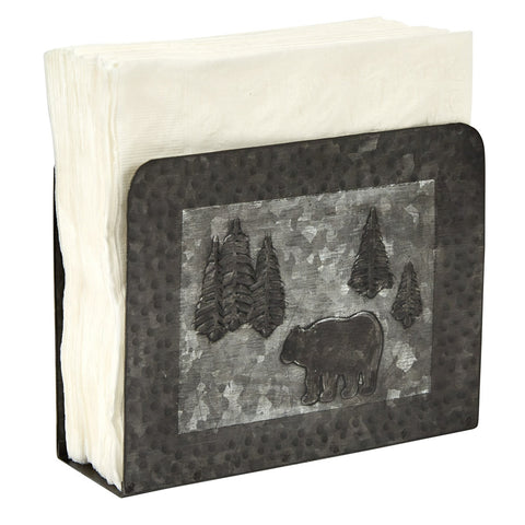 Add a charming rustic touch to your table with our Hammered Bear Napkin Holder. Precision crafted of metal with a forest and bear scene, organize your paper or cloth napkins for everyday use or a special occasion.