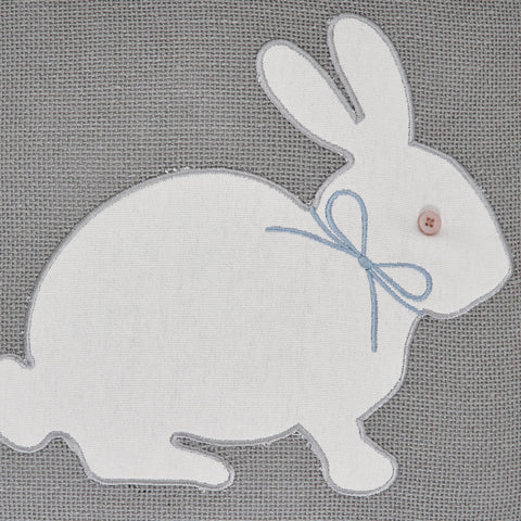 The Burlap Grey Applique Bunny Pillow 18x18 is crafted from creme canvas, featuring layers of cotton burlap. The bunny is appliqued in canvas and features bow embroidery and button eye. Includes button closures for easy access to the 100 percent polyester fill inside.