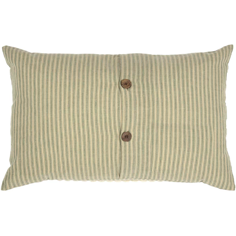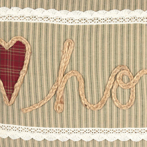Warm khaki and sage striping with rustic details bring a soft, primitive style to your home. Our Sage Winds Home Pillow measures 14 by 22 inches. The cozy, rectangular accent pillow features a classic ticking stripe base in earthy, traditional farmhouse colors softened by creme lace accents. The charming trim gently frames a loopy, braided jute word art accent reading, "home" and two red plaid primitive-style hearts outlined in jute. Constructed with cotton and jute with a polyester fill. Includes a removable cover with button-style closures for easier cleaning.Â