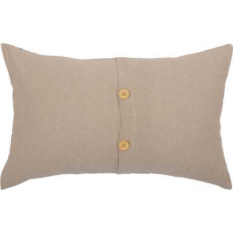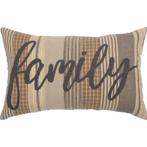 The Farmstead Charcoal Family Pillow 14x22 is the perfect addition to your country farmhouse style home. Featuring strip patchwork on the front in alternating charcoal grey, khaki, and creme fabrics containing the word "Family" appliqued in matching charcoal grey felt. This unique farmhouse pillow is finished with a turned edge seam and reverses to textured khaki chambray fabric two with light wooden button closures.