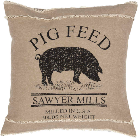 This country pillow brings the farm to Farmhouse décor! The Farmstead Charcoal Pig Pillow features black stenciling of a pig theme on a khaki chambray base with two rows of fringed seams on the top and bottom. Reverses to solid khaki chambray and finished with 2 tie closures.