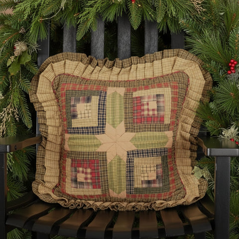 Our Cabin Patch Filled Pillow Quilted features stitch in the ditch hand quilting and log cabin blocks in earthy greens, deep red and warm navy with accent 8-point stars in solid tea stain. Perfect for any bedroom, den or living room. Offers reversible double-ruffle trim in light and dark green plaids.