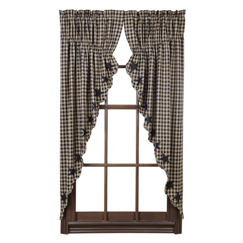 The Blackstone Farm Star Scalloped Prairie Curtain Set offers petite black and tan checks with 5 Point stars appliqued along the scalloped edge in solid black. Lined with luxurious white cotton.