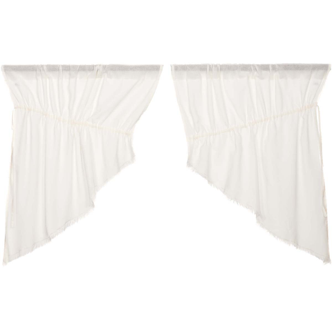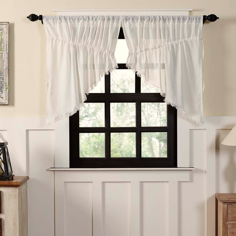 The Tobacco Cloth Antique White* Prairie Swag Fringed Set brings a luxuriously upscale farmhouse look to your home or retreat. A lightweight antique white* tobacco cloth drapes your window in sheer elegance with its soft and simple texture.