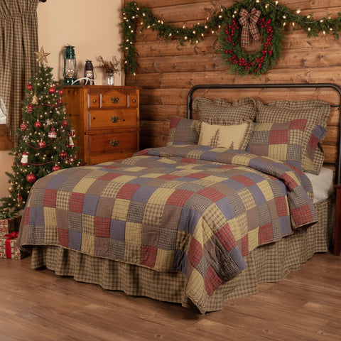 The country Woodsy Ridge Quilt has sturdy 5-inch blocks of plaid and checks of navy, cedar green, and tan that create an enduring patchwork of rustic country comfort. The patchwork is raw and random to catch a sense of variation that is in the spirit of reclaimed driftwood. The Woodsy Ridge Quilt will sate the desire to bring pinewood forests and white mountain mists into the home.