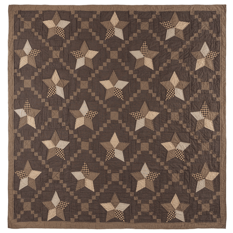 The Five Point Star Quilt features large 5-point stars set on a black micro-plaid, crisscrossed with a traditional Irish chain in black/khaki check patches. Perfect for your country, primitive, farmhouse or cabin bedroom decor.