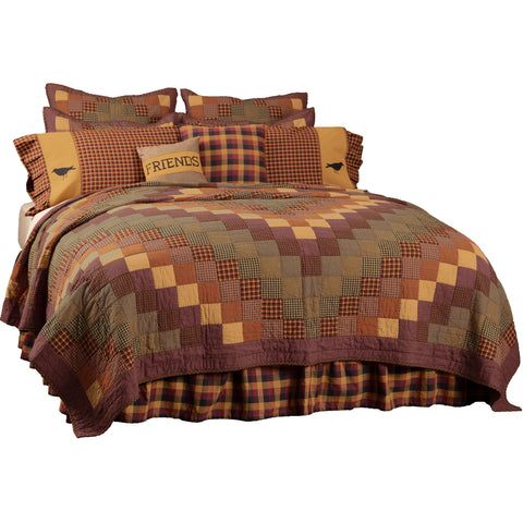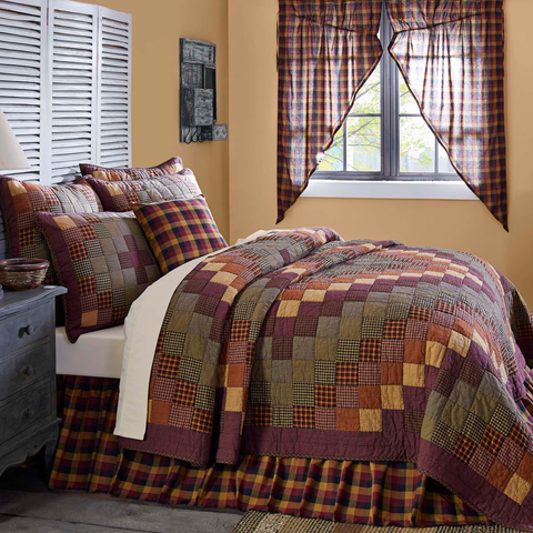 The Heirloom Farm Quilt is decorated with cascading blocks of various crimsons, mustards, and black for a visually mesmerizing and enticing country, primitive or log cabin look. The cascading blocks are then beautifully framed by thick channel bordering. Shams can be purchased separately.