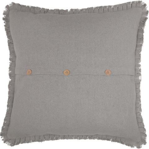 Add a simple yet classic vintage flair to any room with the Burlap Dove Grey Fabric Euro Sham w/ Fringed Ruffle. This dark grey euro sham with its fringed ruffle edges and soft cotton burlap makes an upscale-looking, unique style piece that compliments multiple decor aesthetics such as farmhouse, shabby chic, and traditional country. The wooden buttons can be displayed at the front to create layered interest or use the solid side for neutral simplicity. This 26" x 26" pillow cover is machine washable and iron-safe.