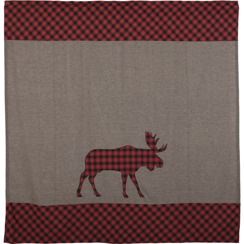 Bring a woodsy look to your bath this year with a warm and relaxed shower curtain. Featuring plaid rectangular block strips on each end, the Boone Trace Moose Applique Shower Curtain gives off a rustic, log cabin vibe with a red and black plaid moose towards the bottom on a grey textured chambray background. Finished with button holes and a rod pocket for easy hanging and machine washable for easy care, this fabric shower curtain adds both functionality and wilderness design to any log cabin, lodge, or lake house inspired home.