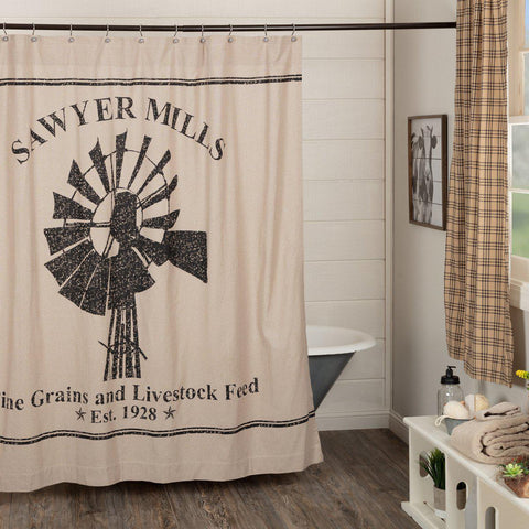 The Farmstead Charcoal Windmill Shower Curtain brings a Farmhouse Country look into the bath with its windmill-themed black stencil in the center over khaki chambray. A single grain sack stripe is stenciled both above and below the center design.