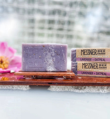 - Ingredients: Saponified oils of sunflower, coconut, palm, and safflower (with retained glycerin), water, essential oils (Lavender and Lavandin), madder root, alkanet root, comfrey root, ground oats, beeswax, raw honey, mineral pigment and rosemary extract