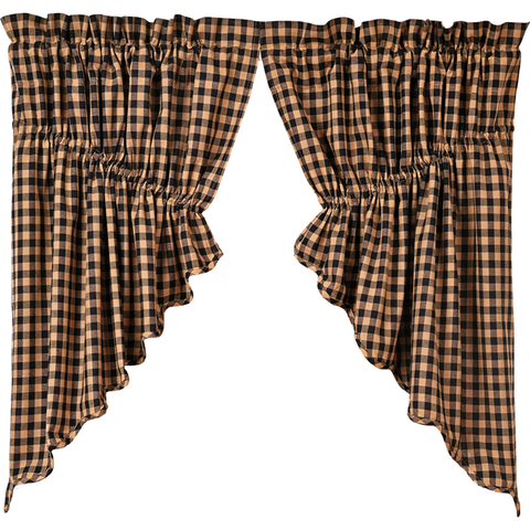 Black and khaki checks are blended with faded texture at points of intersection to give a modern facelift to the classic pattern on the Blackstone Farm Scalloped Prairie Swag Set.
