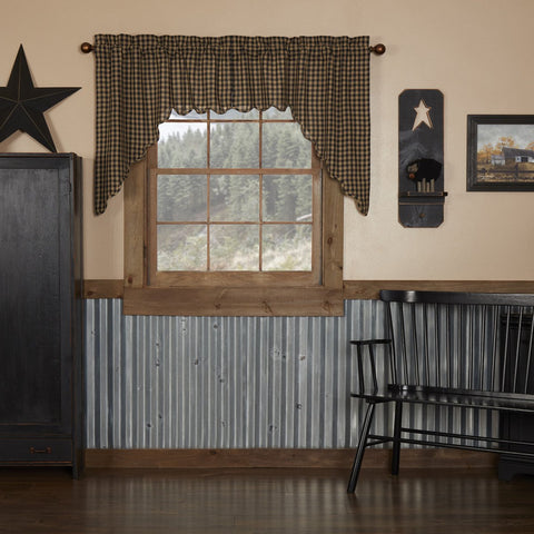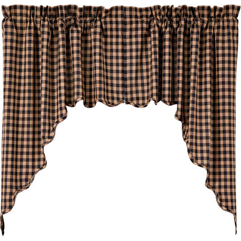 Black and khaki checks are blended with faded texture at points of intersection to give a modern facelift to the classic pattern on the Blackstone Farm Scalloped Swag Set.