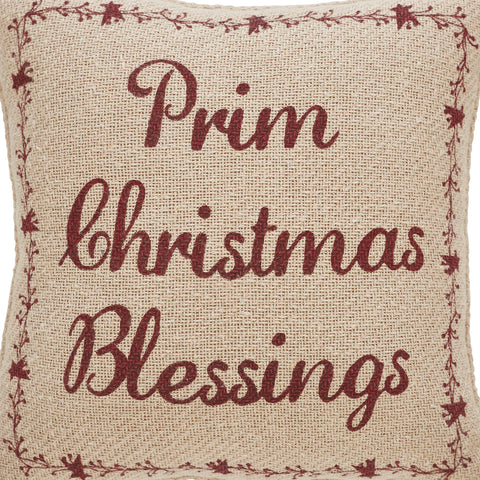 Add warm holiday style with this primitive Christmas accent pillow. The Prim Christmas Blessings Pillow measures 12 by 12 inches. The filled pillow features word art reading, Prim Christmas Blessings surrounded by a matching burgundy border of berries and five-point stars for a simple primitive look with seasonal flair. The cozy home accessory reverses to a plain tan fabric. Spot clean as needed.