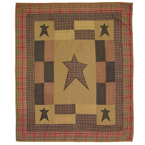 Refresh your country decor with the eye-catching Stratford Quilted Throw. Enjoy the muted mustard, brown, green, and red-orange hues on a dark khaki background with whimsical primitive stars in various colored plaids. Made completely from soft cotton, our 60x50 throw contributes warm, versatile design to your couch, arm chair, bed, or sofa as the cozy palette inspires primitive, Americana, log cabin, and farmhouse-themed looks. This patchwork quilted throw blanket has a 3.25-inch diameter rod pocket on the back for easy wall-hanging and is pre-washed for convenience. It reverses to a solid dark khaki.
