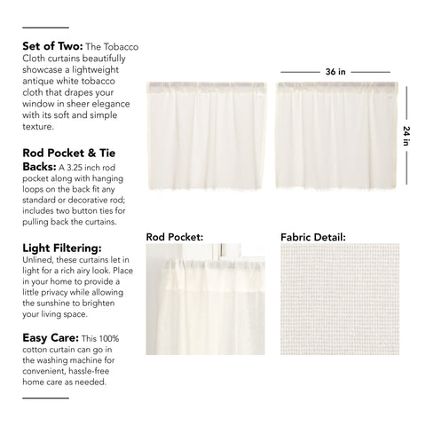 The Tobacco Cloth Antique White Fringed 24" Tier Set features a lightweight antique white (off-white light cream) tobacco cloth fabric. Unlined.
