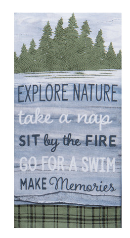 Clean air, bright stars, campfires, & family fun? what could be more satisfying? This woodsy towel features 2-in-1 functionality with a flat weave front ideal for drying glassware, and absorbent terry cloth back side for everyday kitchen tasks! 16 in x 26 in, 100% cotton.