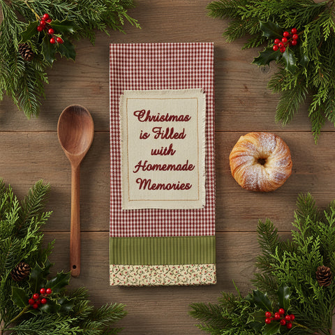 Add a Holiday touch to your kitchen with the Christmas Memories Dishtowel. This dish towel will serve as the perfect kitchen décor and/or gift. Features embroidered phrase: "Christmas is Filled with Homemade Memories". Measures 18" x 28". Towel Color: red, green and beige hues.
