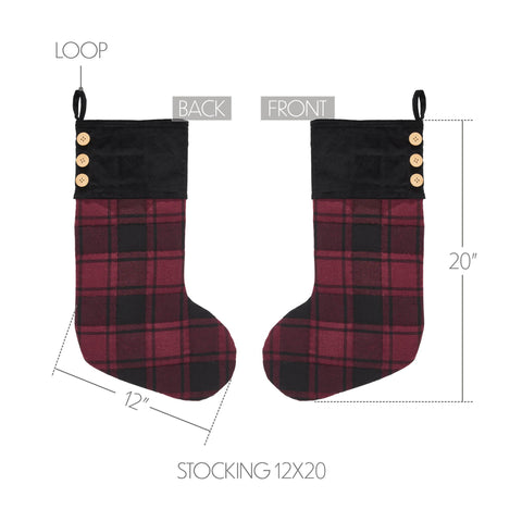 Hang these stockings with care to add Christmas style to your rustic country decor. The Boone Trace Red Black Plaid Stocking measures 12x20 inches and features a quilted base of red and black plaid. The cuff offers a soft contrast with black velvet adorned with buttons accents. The plaid Christmas stocking includes a taffeta lining. Coordinates with the Boone Trace Collection for rustic country style for your whole home.