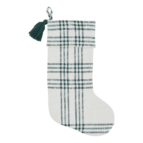 Add modern style to your Christmas traditions with the Pinebury Plaid Stocking. A crisp white base with pine green stripes will add simple, sophisticated style for a perfect farmhouse Christmas look. Easily hang with the attached loop. The elegant Christmas stocking is made for yearly use with a cotton base and flannel lining. Pair with matching tree skirts for a complete, festive holiday look.