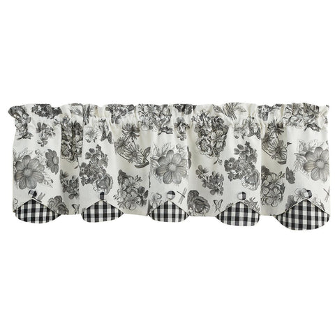 The Black Check Geranium Layered Valance tastefully combines layers of black and white geraniums, dragonflies and butterflies fabric, black and white check scallops, and black and white check buttons. It's the perfect blend of farmhouse elegance and country cottage charm. Lined with 100% white cotton.