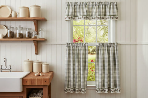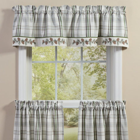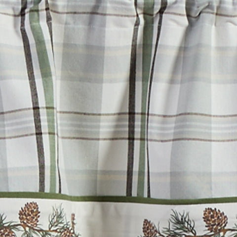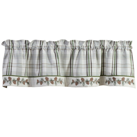 The Ponderosa Pine Lined Bordered Valance provides the perfect window treatment for your country home, with the striking grey, white, brown and green color palette! The bottom border features pine cones.
