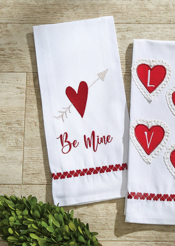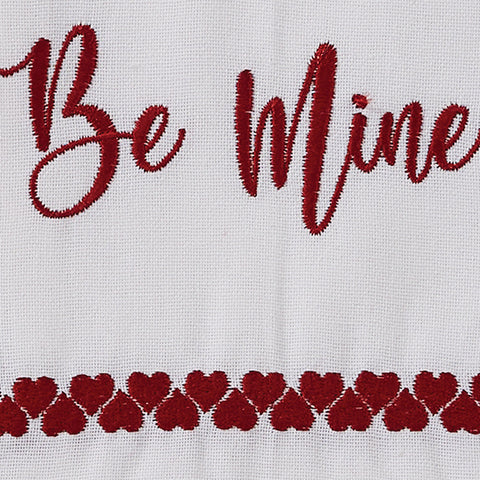 The embroidered Be Mine Towel adds a punch of Valentine's Day color to your farmhouse or country kitchen! White and red cotton featuring an embroidered Be Mine with heart and arrow.
