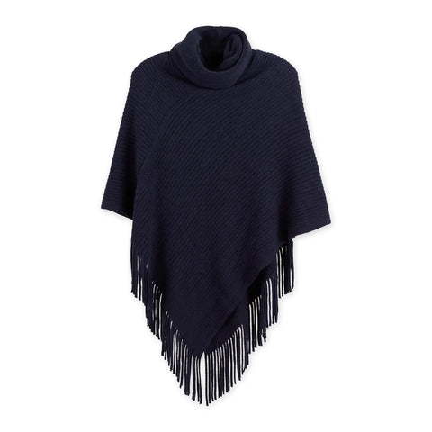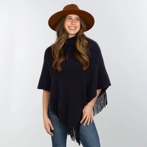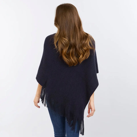 The Navy Margo Poncho is a versatile layering piece ideal for transitional weather and everyday wear. Made from a mid-weight ribbed knit, it offers warmth without added bulk. The sleeveless silhouette layers easily over tops and sweaters, while the rolled neckline provides styling flexibility—fold for structure or leave unrolled for a relaxed look. Finished with an asymmetrical hemline and soft fringe for added movement and a flattering drape.