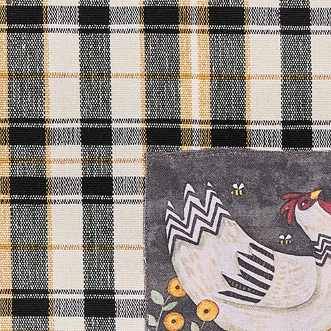 Our Sussex Hen Placemat Set of 4 brings a farmhouse touch to your table.   Featuring an appliqued patch with a white Sussex hen surrounded by yellow flowers and buzzing bees!